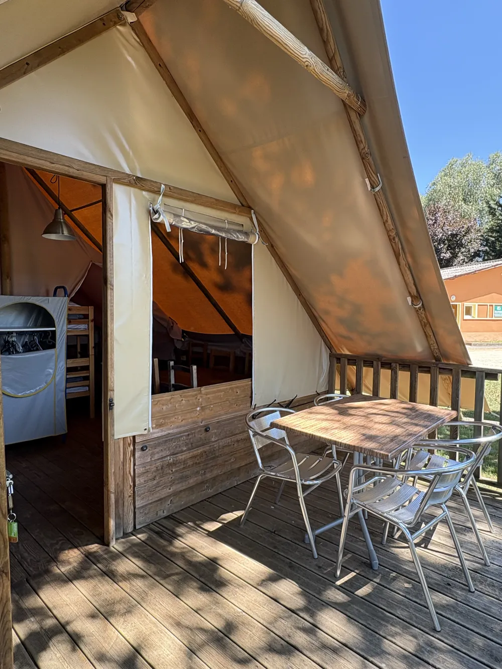 Sa conception en bois naturel et toile isolante garantit une ambiance chaleureuse, tandis que la terrasse en bois invite à partager des repas, lire à l’ombre ou simplement profiter du calme du bord de Saône.